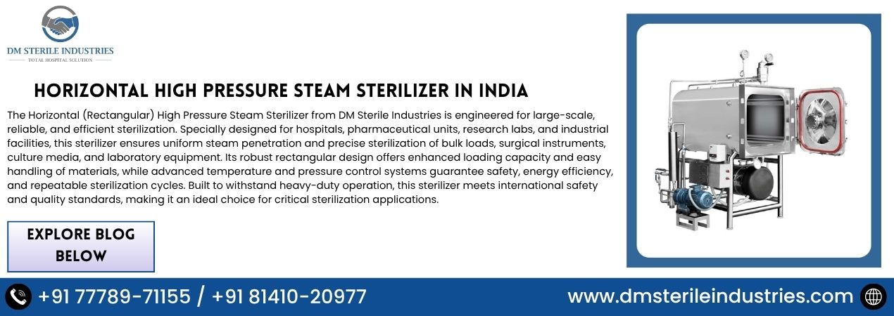 A Horizontal High Pressure Steam Sterilizer is a highly versatile and robust system used extensively across hospitals, pharmaceutical facilities, and laboratories in India. It utilizes high-pressure saturated steam for the rapid and effective sterilization of surgical instruments, textiles, culture media, and lab equipment. Known for its large capacity and ergonomic front-loading convenience, this equipment is the gold standard for bulk sterilization, ensuring that complex medical and research tools are rendered completely free from all forms of microbial life, supporting superior healthcare outcomes and safe laboratory practices.